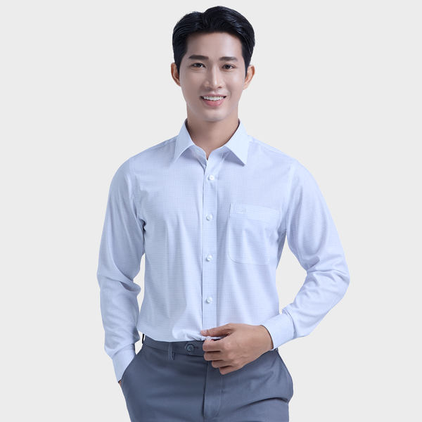 Kiểu dáng: Áo somi nam tay dài Body, một túi bên ngực, Măng sét tay áo có thêu logo tạo điểm nhấn